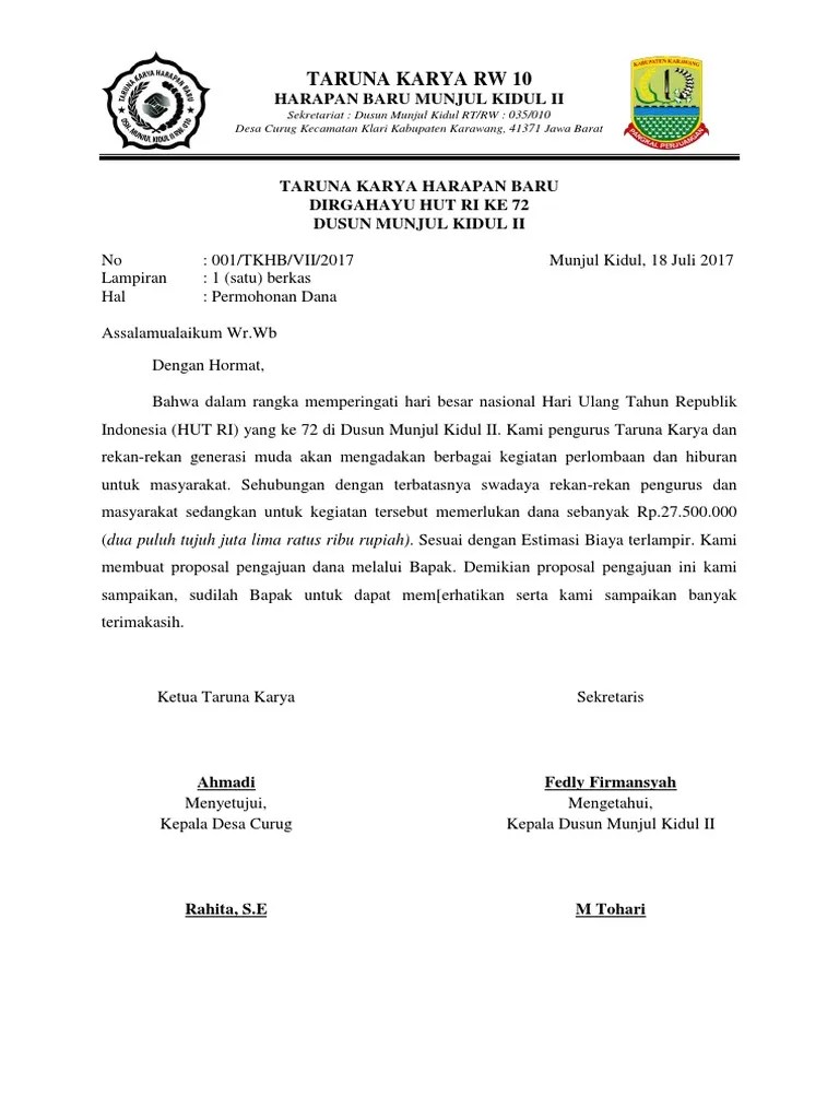 Dengan hormat, berkat rahmat tuhan yang maha esa atas . Semoga sebagala bentuk bantuan bapak/ibu dicatat sebagai amal dan bermanfaat bagi masyarakat setempat, khususnya kami selaku panitia. Contoh proposal kegiatan 17 agustus untuk tingkat rt yang singkat,. Kangjamal.com proposal 17 agustus perusahaan doc) contoh proposal . Contoh proposal pengajuan bantuan dana untuk acara 17 agustus by rahmadi4febri4andika in types > legal forms, proposal dan lomba.